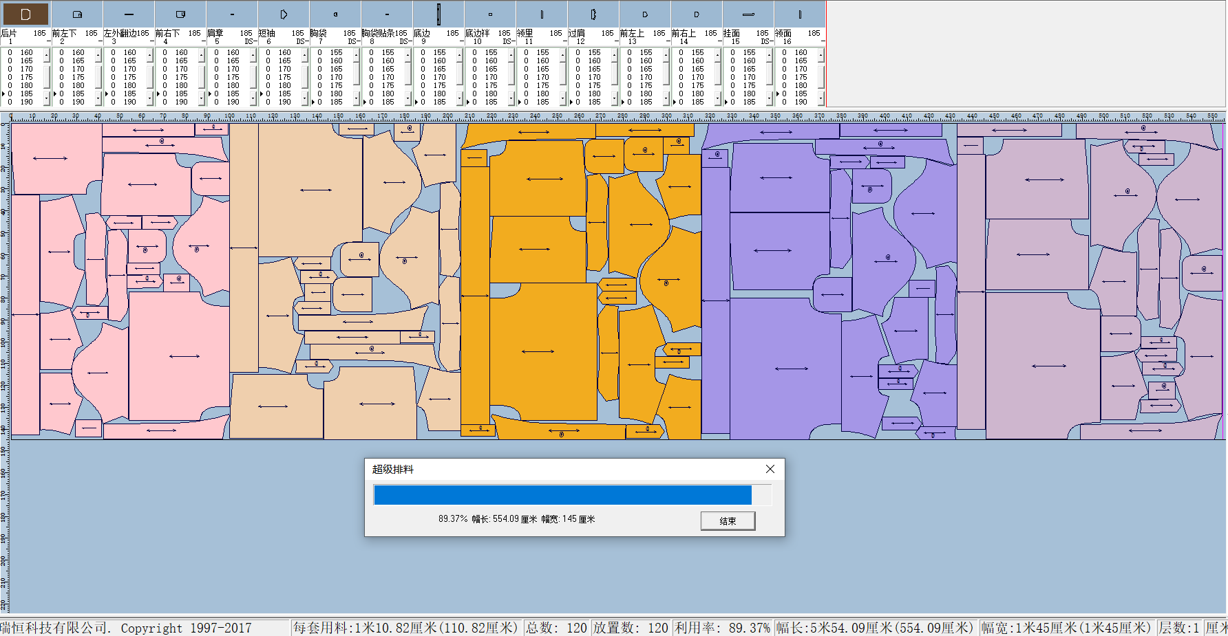 2.单件分段超排:   每一整件衣服所有样片分成一组放在一段内(适合段位色差的处理,可以将特定纸样捆绑成组后操作);