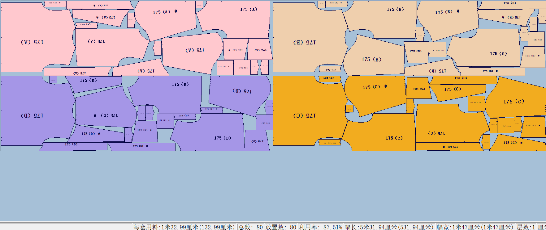 3.单码分段超排:   将同一个码的纸样排列在一段(同一组合)内,每个码可以是一件或者多件;