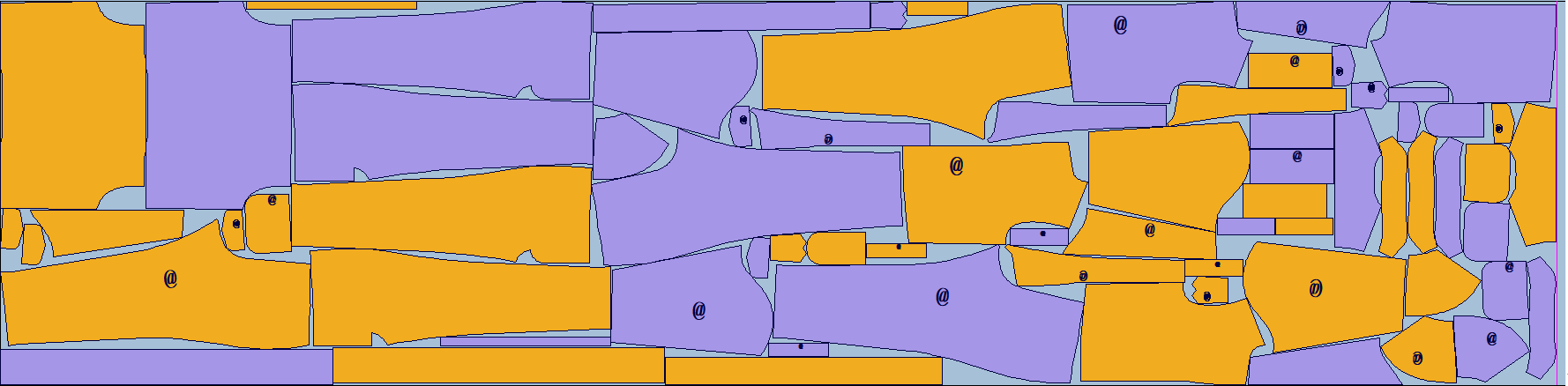 7.距离分段超排:   设定每一段的长度和像个距离后,系统自动将纸样在每一段内按照最大利用率进行摆放,适合平板切割机的纸样打印,张段面料(水衣水裤)的裁剪排版等;
